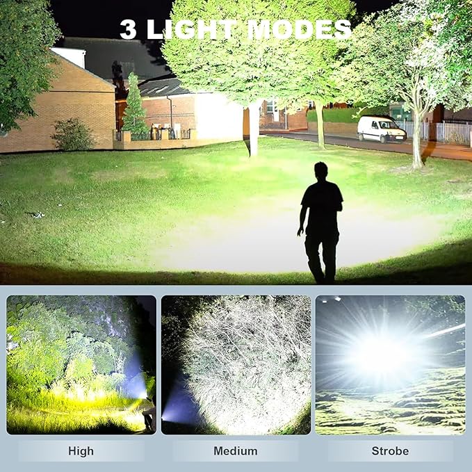 - [3 Mode Flashlight | Adjustable Beam] - 3 Lighting Modes for Different Needs. This high lumen flashlight has 3 lighting modes (high, medium and strobe). By stretching the head adjustable beam, you can switch the focused light to see distant objects, or switch the wide beam to expand the illumination range.