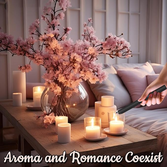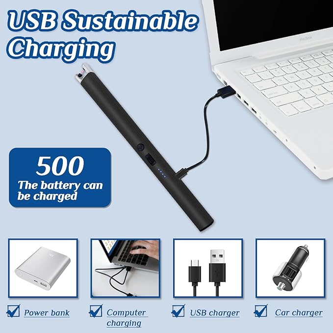 - [Easy Charging, Convenient Life] - The electric candle lighter is equipped with a USB charging cable, which is convenient for you to charge anytime and anywhere. There are 4 power indicator lights on the lighter handle. When only one light is on, please charge it in time. Each charge only takes 60 minutes to be fully charged. When fully charged, all 4 LED lights will light up. This rechargeable lighter can be charged over 500 times, so you don't have to worry about long-term use.