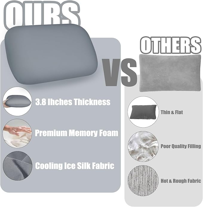 - 3.8 Inch Thick Memory Foam. Camp pillow can rebound in 3-5 seconds and very firm for sleeping. Car pillow can provides outstanding support and find the perfect comfort level, giving you the ultimate sleeping experience. Airplane pillow is perfect for side sleepers, back sleepers and stomach sleepers.