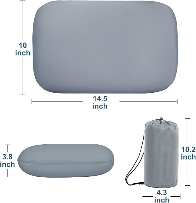 - Lightweight & Easy to Carry. Camp Pillow Size: 14.5 x 10.0 x 3.8 inches. Packed Size: 10.2 x 4.3 x 4.3 inches. Camping pillow for sleeping can be fold easily into a small travel bag with adjustable buckle and drawstring design. Travel pillow is small and light which is easy to carry when you go outside.