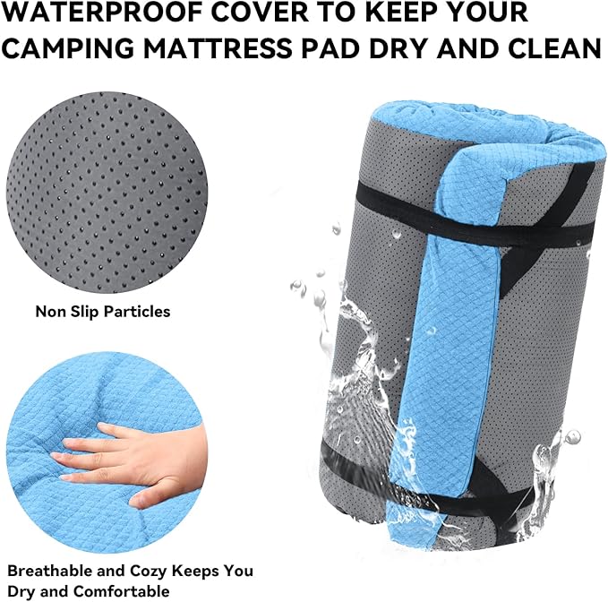 - 【Non Slip】The portable mattress pad comes with amazing straps to attach the mattress to your camping bed.The straps will ensure the mattress remains in place and doesn't move.The rubber dots on the bottom fit securely on the massage bed and do not shift easily, maintaining a fixed and comfortable position.