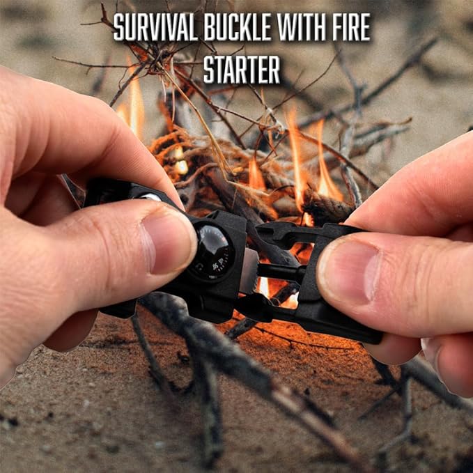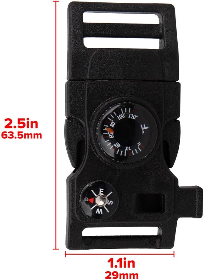 - 14 TOOLS INCLUDED: The tools contained within the buckle include a Whistle, Thermometer (Celsius), Firestarter, Compass, Phillips Head Screwdrivers, Flathead Screwdrivers, and a 5/16” Wrench ensuring that no matter the situation you are prepared.