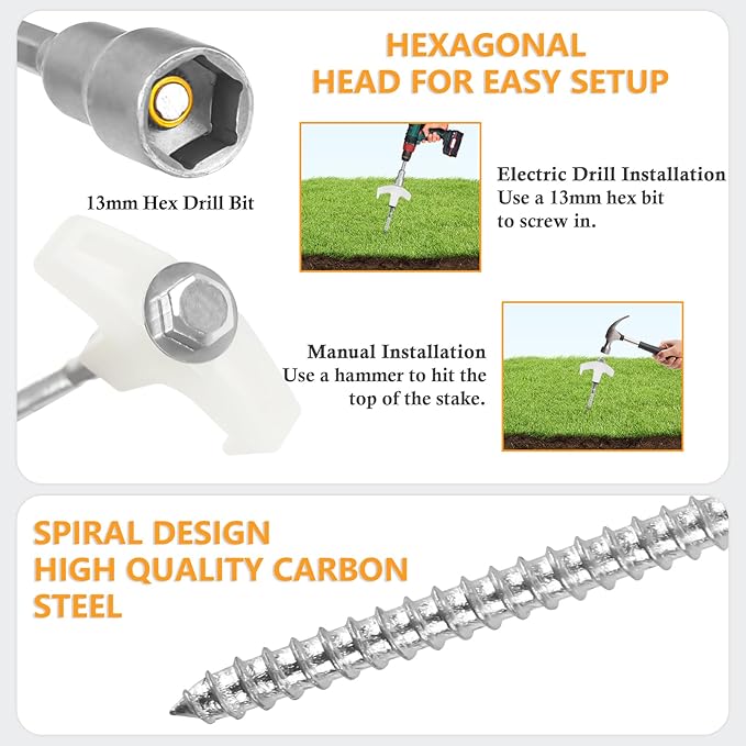 - 🧰𝐅𝐥𝐞𝐱𝐢𝐛𝐥𝐞 𝐈𝐧𝐬𝐭𝐚𝐥𝐥𝐚𝐭𝐢𝐨𝐧 - Considering the convenience of using screw tent pegs, we provide right tool accessories for installation. Equipped with 1 power-driven 13mm drill bit, you can use a drill tool to easily drive the stakes into the ground. Or use a hammer tool for installation. The spiral structure of the metal threaded tent spike provides a stronger grip.