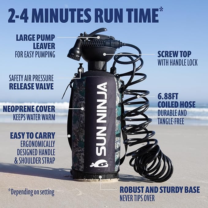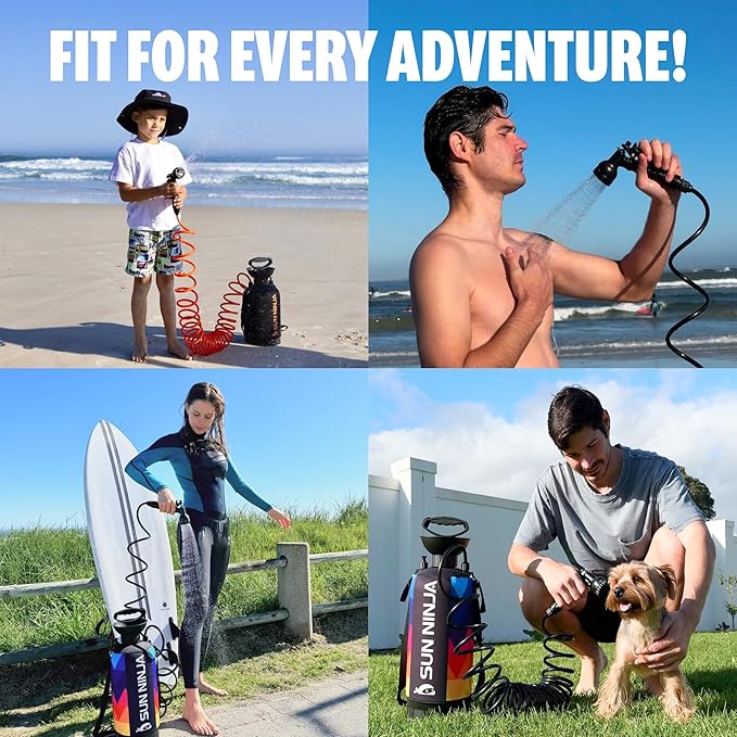 - MULTI-PURPOSE USAGE - Sun Ninja Portable shower is convenient to fill, comfortable to carry and easy to pressurize. It is ideal to use as a camping shower, portable water hose, surf shower, beach shower, dog sprayer, fishing accessories and rinse kit for car and boat.
