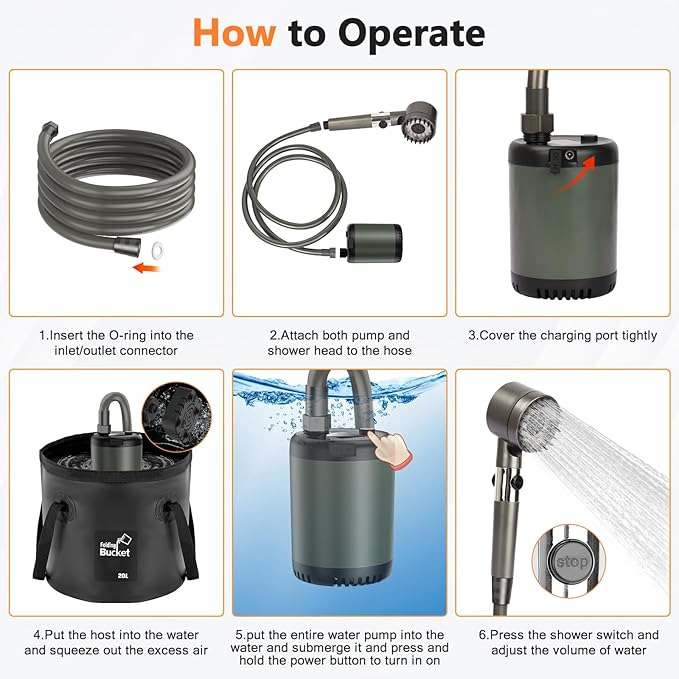 - 【Easy to Assemble and Operate】The camping shower is very simple to use, long press the battery box switch for more than 3 seconds to start the water pump. The showerhead is equipped with 3 selected modes and a stop switch, you can easily switch between modes by simply turning the handle on the showerhead panel. The camping showerhead delivers 1.32 gallons per minute (5 liters per minute) of soft, comfortable water