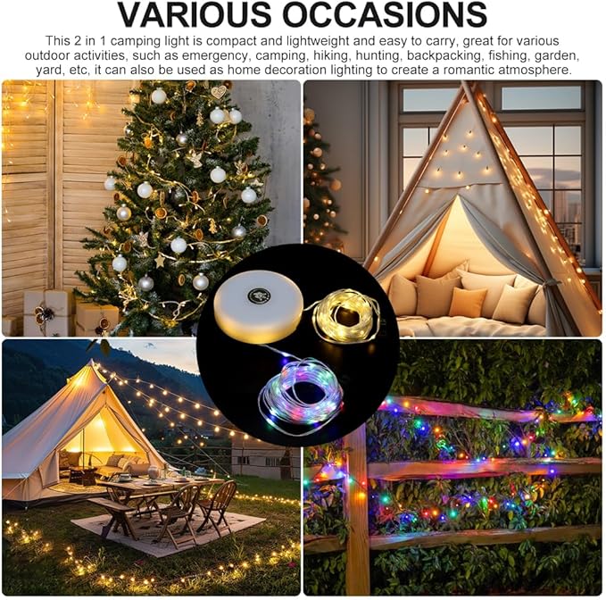 - 【Portable & Versatile】This 2 in 1 usb camping string light is compact and lightweight and easy to carry, great for various outdoor activities, such as emergency, camping, hiking, hunting, backpacking, fishing, garden, yard, etc, it can also be used as home decoration lighting to create a romantic atmosphere.