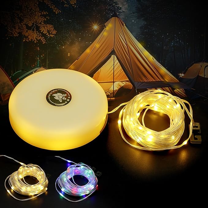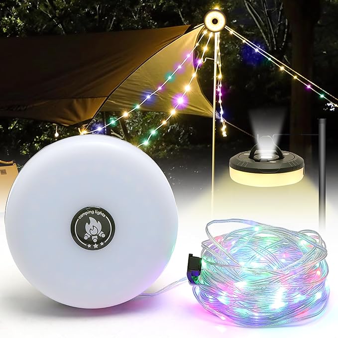 - 【8 Lighting Modes】The string lights for camping is soft and bright, with LED long-range light in the middle. There are 8 lighting modes in total, string lights warm white light - string lights RGB alternate flashing - string lights RGB breathing - LED 2835 warm white + string lights warm white light - LED 2835 strong light, press and hold for 3s: XTE strong light - weak light - flash.