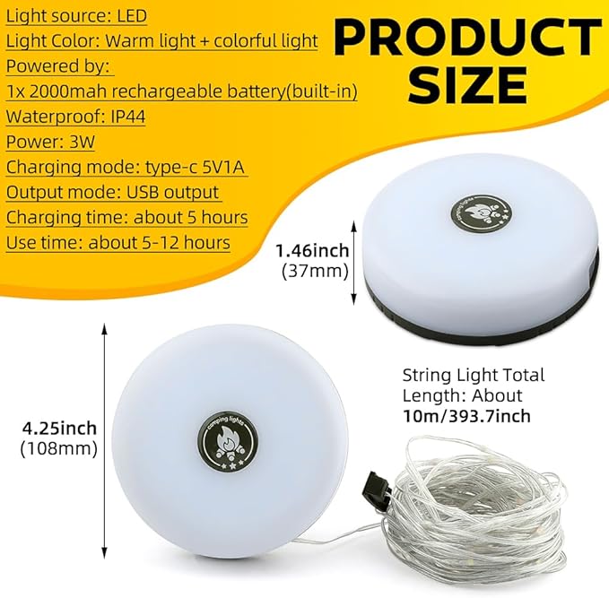 - 【Portable & Versatile】This 2 in 1 usb camping string light is compact and lightweight and easy to carry, great for various outdoor activities, such as emergency, camping, hiking, hunting, backpacking, fishing, garden, yard, etc, it can also be used as home decoration lighting to create a romantic atmosphere.