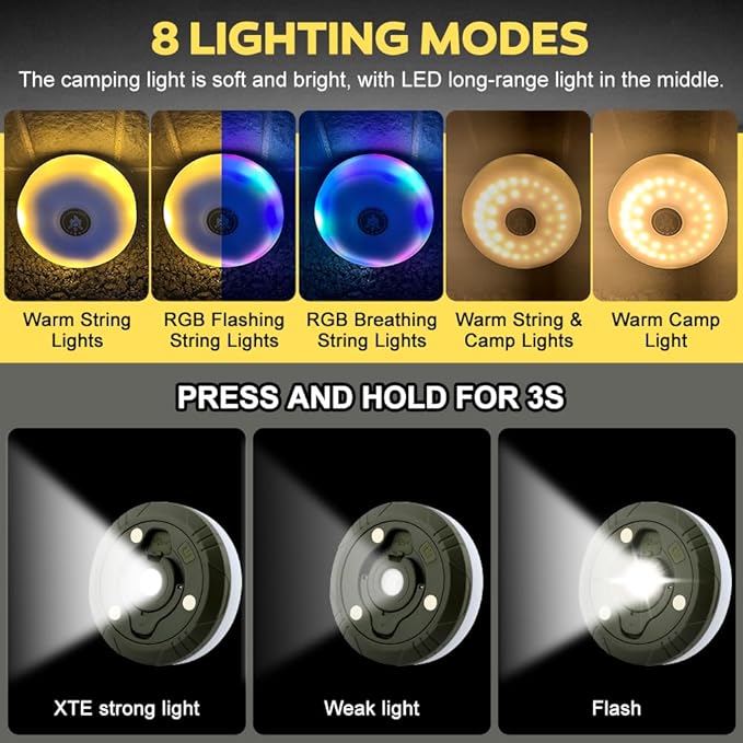 - 【8 Lighting Modes】The string lights for camping is soft and bright, with LED long-range light in the middle. There are 8 lighting modes in total, string lights warm white light - string lights RGB alternate flashing - string lights RGB breathing - LED 2835 warm white + string lights warm white light - LED 2835 strong light, press and hold for 3s: XTE strong light - weak light - flash.