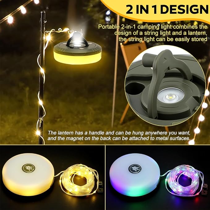- 【2 In 1 Design】Portable 2-in-1 camping string light combines the design of a string light and a lantern, the string light can be easily stored, the lantern has a handle and can be hung anywhere you want, and the magnet on the back can be attached to metal surfaces.