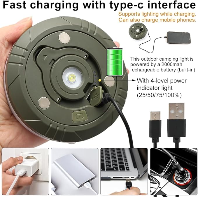 - 【USB Rechargeable】This outdoor camping light is powered by a 2000mah rechargeable battery (built-in), fast charging with type-c interface, overcharge, over-discharge and over-current protection, safe and low voltage, with 4-level power indicator light (25/50/75/100%). It supports lighting while charging. Can also charge mobile phones.