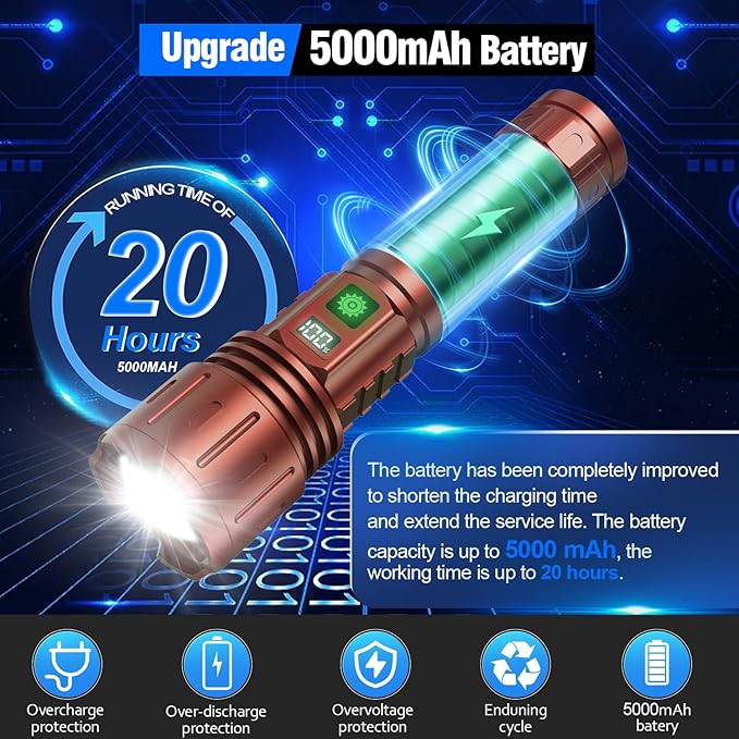 - Long Runtime with 5000mah Ba-tt-ery: Hoxida Tactical Rechargeable flashlight could run up to 20Hours in Low Modes, never let you worry about the power off , This High Lumen rechargeable flashlight is widely used in outdoor survival activity, like camping, hiking, fishing, BBQ, dog walking or any outdoor activities.