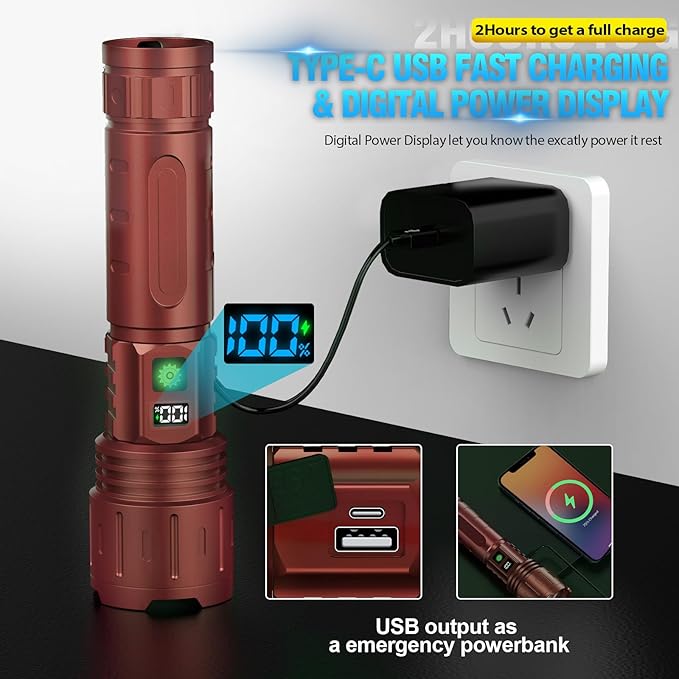 - Rechargeable Flashlight & Power Digital Display: USB Type C port for 4 hours fast charging your LED Flashlight, and USB Output used as emergency powerbank to charge your phone , GPS, Camera , a good helper during in your camping trip or emergency use, sametime thsi rechargeable LED Flashlight equipped a Power digital display make it easy to know exactly how much power is left when using the flashlight.