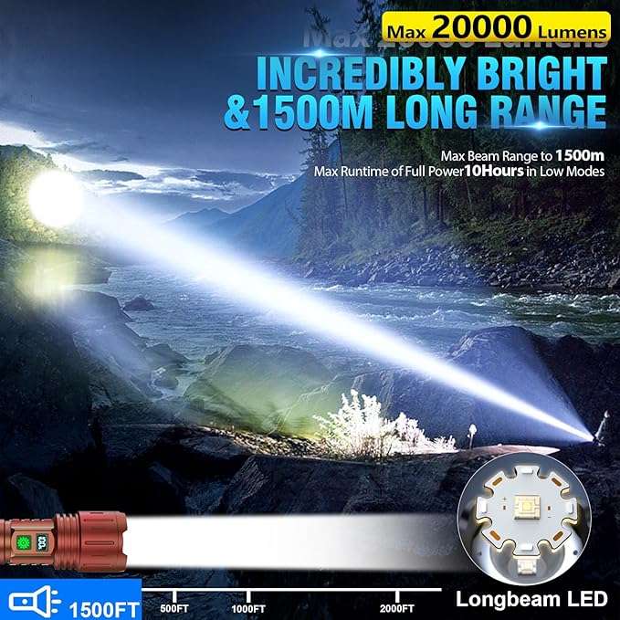 - Super Bright Long Beam Flashlight: Try our Hoxida rechargeable 20000 high lumen flashlight, with an optical-grade double-convex lens that produces a perfectly balanced beam, This Powerful LED Flashlight REAL illumination distance can be reach up to 1500ft, light is more wider and brighter than ordinary LED flashlight.easily easily lock the target and lighting up an entire room or backyard.Especially suitable for special needs such as field search, sea rescue, long-distance instructions, etc.
