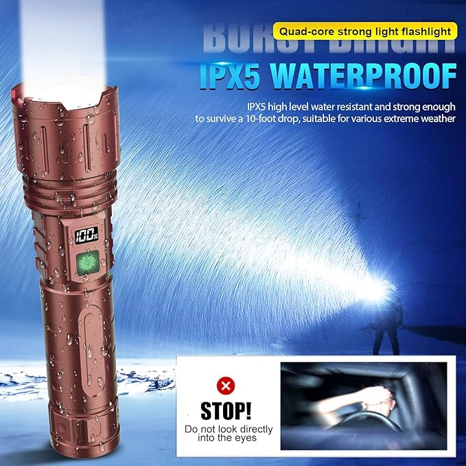 - Waterproof, Compact & anti-slip durable: High Lumen Tactical Flashlight with sturdy aluminum body makes IPX6 Waterproof for all weather use and has impact resistance. This powerful Rechargeable flashlight set included a 1pcs Led Rechargeable Flashlight, 1pcs usb type C cable, 1pcs user manual . 1pcs storage box . YOU WILL LIKE OUR HIGH LUMEN LONG BEAM LED FLASHLIGHT!