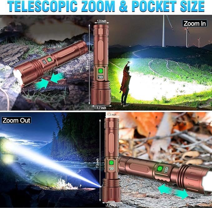 Flashlights 20000 High Lumens Rechargeable - 1500 Meters Long Beam Super Bright LED Flash Light with Power Display & IPX5 Waterproof for Camping, 20H Runtime,5 Modes,Zoomable Handheld Flashlight-Brown