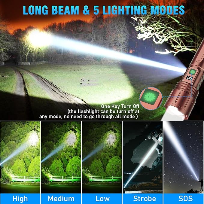 - Special Feature : Long Beam LED high Lumens, with power disaply, COB 5 Lighting Modes, One key turn off, Type c USB Fast charging,Power bank function, Zoomable, Waterproof, easy to use, lightweight,tactical Long Beam LED high Lumens, with power disaply, COB 5 Lighting Modes, One key turn off, Type c USB Fast charging,Power bank function, Zoomable, Waterproof, e… See more