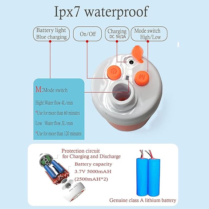 • 【USB portable shower】: Built in 4800mAh high-energy lithium battery, rechargeable battery, shower pump equipped with low battery indicator light (red light) and charging indicator light (blue light).