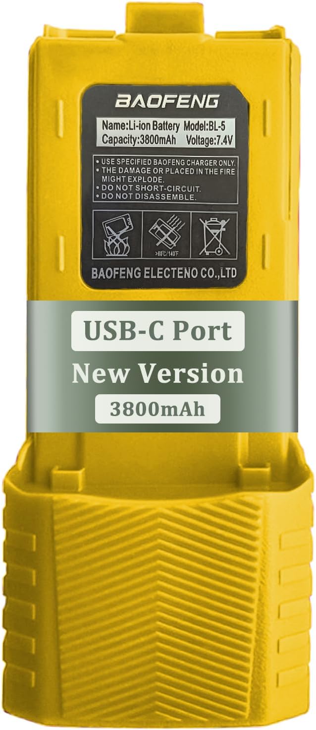 BAOFENG UV-5R Radio Battery Extended 3800mAh USB-C Charging Yellow Replacement for BF-F8HP New Version for BF-F8 Rechargeable Bl-5 Two Way Radio Battery