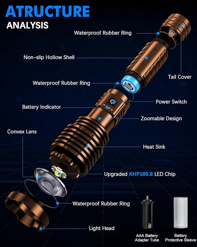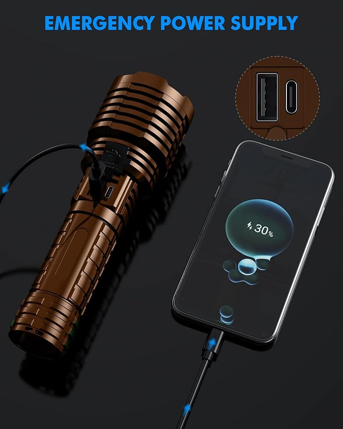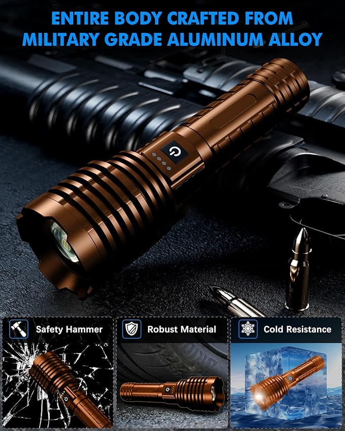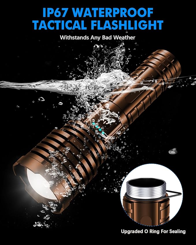 - 👍Shockproof & IP67 Waterproof: Crafted for precision and durability, our high power flashlight features aviation-grade aluminum construction for enhanced strength and heat dispersion, ensuring optimal performance even during extended use. With an IP67 waterproof rating, it offers durability in harsh weather.The use of aviation aluminum underscores a commitment to quality, making this rechargable flashlight a robust companion in various situations.