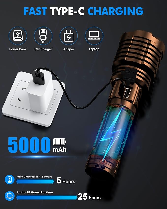 - 🕕Long-lasting Flashlights with Power Display: Equipped with a 5000mAh battery, our high-lumen flashlight rechargeable typically requires 5 hours for a full charge. Once charged, it can provide up to 25 hours of continuous usage. Moreover, our LED flashlight features a power display function: Blue for high power/full charge, and red for charging/needs recharging. Enjoy reliable performance and clear power status updates for uninterrupted illumination whenever needed.