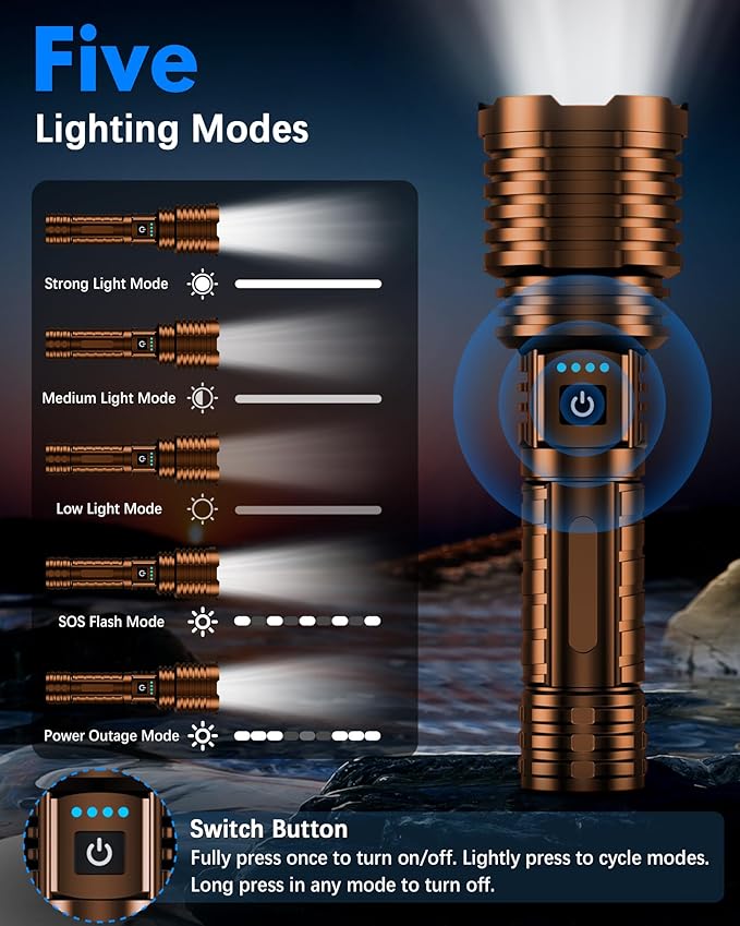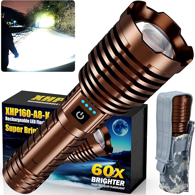 - ☀️ Super Bright Flashlight with Holster: With an astounding 2500000 lumens and a remarkable beam distance of 1500 feet, our upgraded high powered flashlight is a beacon of light in the darkest of environments. Perfect high lumen flashlight for outdoor adventures, hiking, camping, emergency preparedness, household tasks, and professional use.