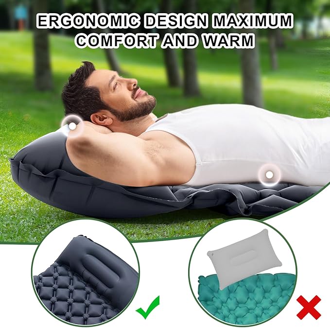 - 【EInnovative Design&Sleep Support with Pillow】 The self inflating sleeping pad for camping eatures a creative design, combined with body-mapping technology, providing a perfect, durable, and super comfortable camping experience suitable for any sleeping position. and built-in pillow are designed to relieve back and neck pressure, allowing you to freely adjust your body balance and comfort, whether on your back or your side, ensuring maximum comfort and warm for your sleep all night!