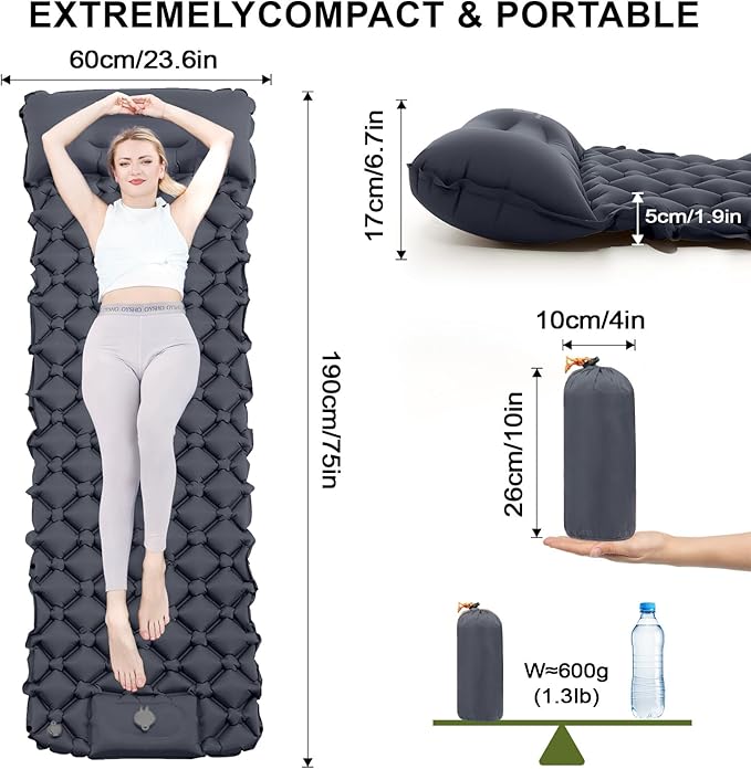 - 【Robust and Lightweight Construction】 The ultralight inflatable camping pad Crafted from top-tier outdoor-grade materials, this camping pad stands up to diverse weather conditions. Weighing a mere 21 ounces (approximately 600 grams) and measuring 75 inches x 23 inches, it's your ideal lightweight companion, complete with a waterproof design for versatile outdoor use.