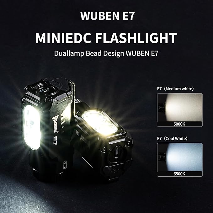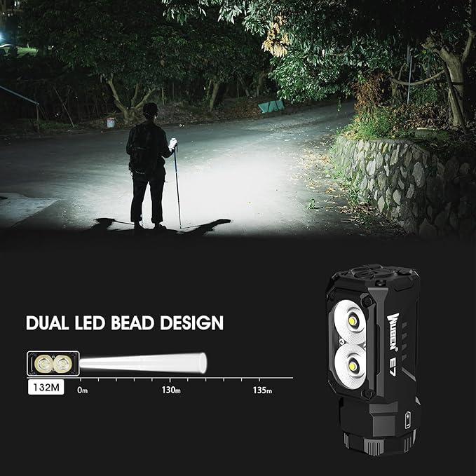 - 【PERSONALIZED EDC FLASHLIGHT】: WUBEN E7 is a multi-purpose EDC flashlight that shows your personality. The appearance is stylish and trendy, equipped with P9 high color rendering 5000K LED lamp beads, which can provide high output up to 1800 lumens and 175° ultra-wide-angle floodlight.It is also a very stable headlamp; you only need to fit it into the ergonomic headband; freeing your hands while still providing a stable light.