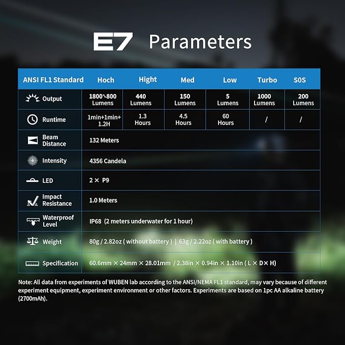 - 【YOU WILL GET】E7 Flashlight × 1, Rechargeable Battery × 1, Type-C Charging Cable × 1, Spare O-Ring × 2, User's Manual, Warranty Card × 1; If you have any questions about how to use the product or how to mix and match parts, please contact us!