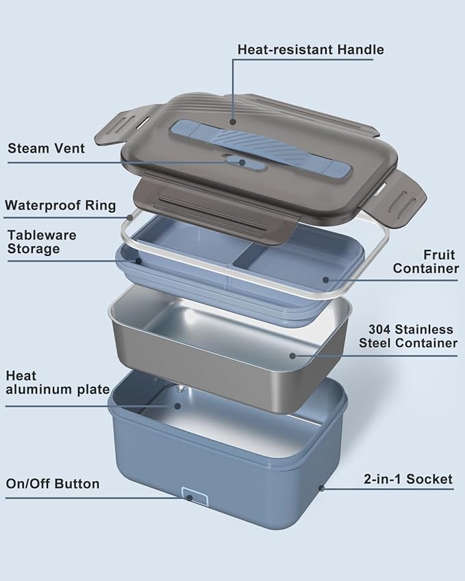 - Double Layer Design - 2 stackable containers, the bottom stainless steel container can hold 1.8L of food, and the upper layer of PP material container contains three small compartments (1 tableware storage and 2 separate compartments of fruit storage). The lonchera eléctrica portátil is perfect for packing a variety of foods in healthy portions, helping you achieve a balanced diet while keeping the food's original flavor!