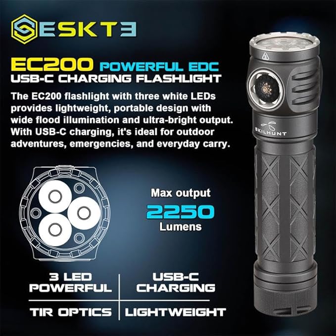 EC200 Powerful EDC 2250 lumens USB-C Rechargeable LED Flashlight - Lightweight, Compact Mini Pocket light Home use Camping Hiking Running Waterproof Outdoor Sports Hands-Free (Cool White 6500K, Black)