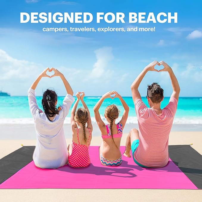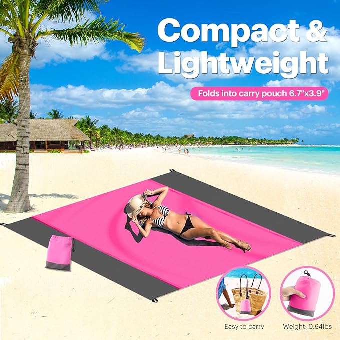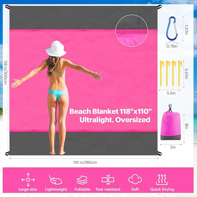 - LARGE SIZE DESIGN: The extra large beach mat is specially designed for family travel, providing enough space to lie down, rest and relax. Beach mat waterproof set includes 1 beach blanket, 4 stakes, 1 carabiner. Beach blanket measures 118" x 110", sleeps up to 10 adults, and weighs 12 oz.