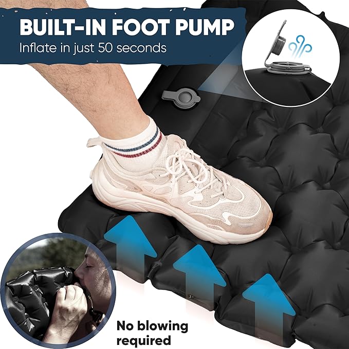 - Sleeping Pad for Camping 2 Person: Our upgraded camping mat have an inbuilt pillow. It comes with a foot pump and inflates in just 50 sec with no blowing required. It has a non-leak air valve. The snap button on both sides help to convert it into a double bed. Please purchase 2 camping mat if you want double bed. Light & small when packed, it won't cause backaches from its weight and fits easily in your backpack. Being insulated, it's perfect for the best night of sleep during adventure, hiking, camping, backpacking in any weather!