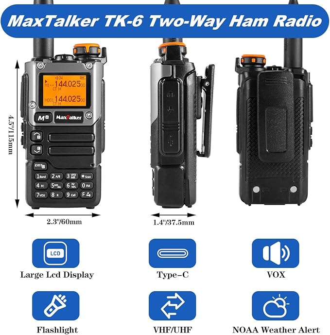 TK-6 5W Ham Radio Handheld Long Range with 1600mAh Type-C Charging Battery, UHF VHF FM AM Multi-Band Two Way Radio with NOAA Weather Forecast(2 Pack)