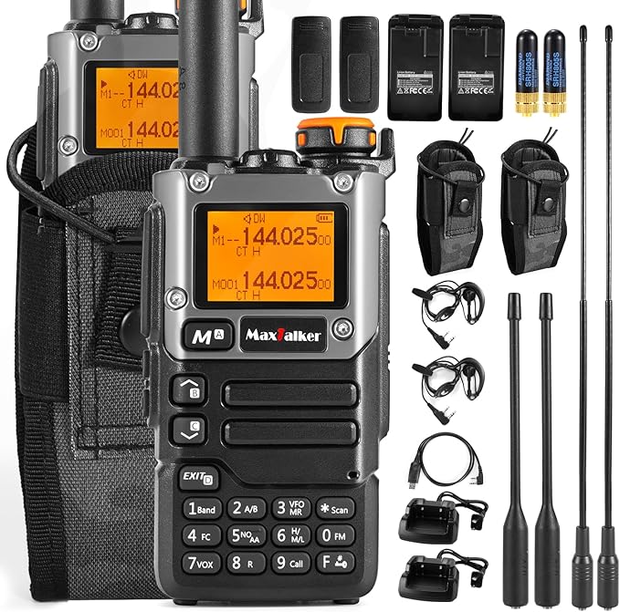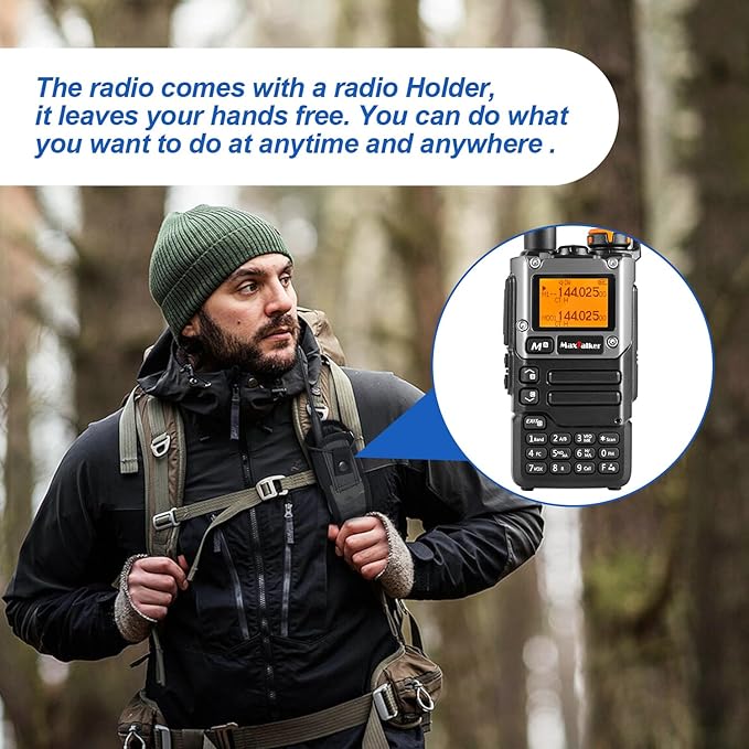 - 【MaxTalker TK-6】AM/FM; VHF/UHF standby, 144-148MHz/420-450MHz, city: 1-2 miles, Wilderness: 8-10 miles, 200 channels, copy frequency/VOX hands-free function. The package comes with a radio Holder, it leaves your hands free. You can do what you want to do at anytime and anywhere .