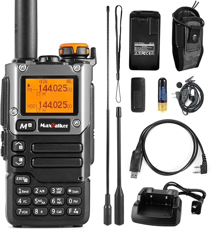 - MaxTalker TK-6: AM/FM; VHF/UHF standby, 144-148MHz/420-450MHz, city: 1-2 miles, Wilderness: 8-10 miles, 200 channels, copy frequency/VOX hands-free function. The package comes with a radio Holder, it leaves your hands free. You can do what you want to do at anytime and anywhere .