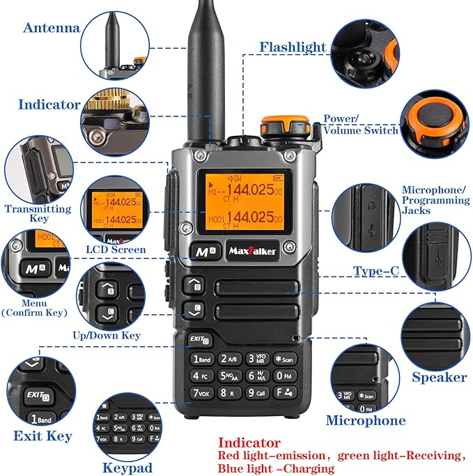 - Type-C Charging: 1600mAh rechargeable battery and Type-C charging port on the side of the MaxTalker radio can make your radio last longer and make travel more convenient(you can use the charging base, and some mobile phone charging cables can also be charged directly); it also comes with flashlight, NOAA Weather Alert, emergency alarm, etc.