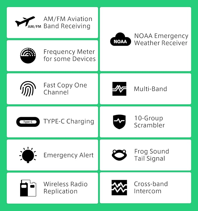 - 【Main Features】Emergency weather channel receiving; AM/FM aviation band receiving; cross-band intercom; channel scan and add; FM radio; DTMF; fast copy one channel; Type-C and charge-base charging etc.
