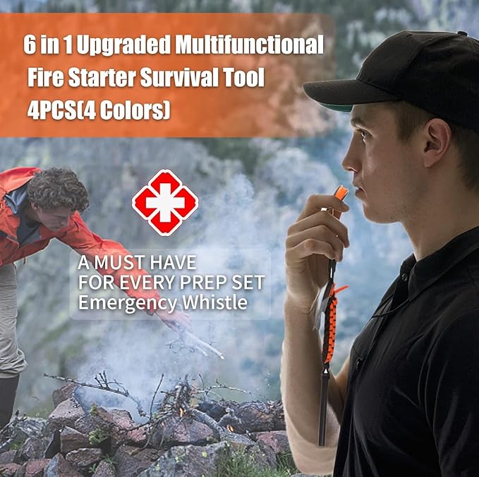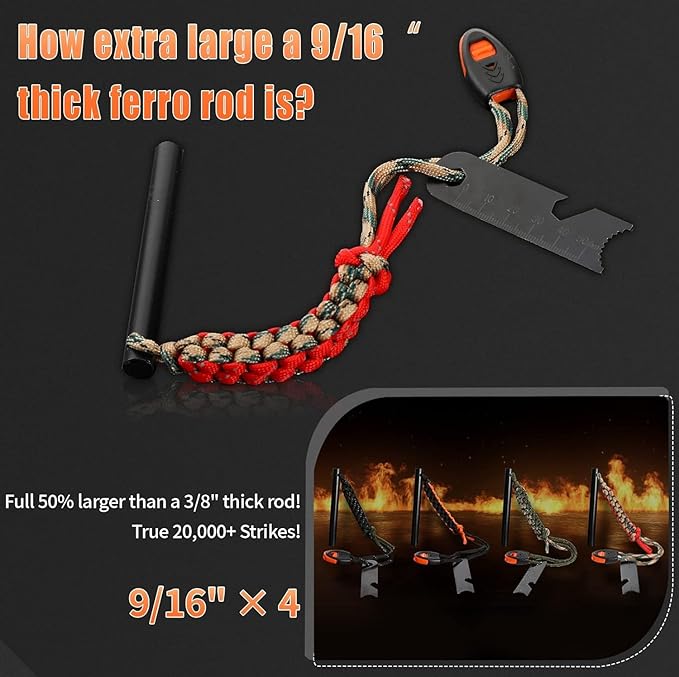 - All-in-One Survival Tool: In addition to its main ignition start function, it also includes a whistle for emergency signals, a sturdy and multifunctional steel scraper that can serve as a straight-edge striker, scraper, map scale, ruler, and hex wrench.