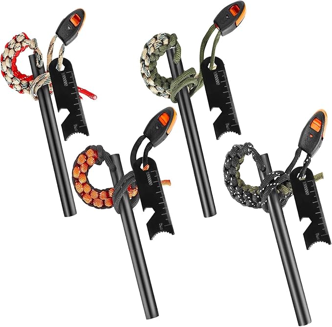 - 4-inch Ferro Rod Fire Starter: You will receive 4 sets of 3/8 inch diameter firestones with survival whistles, which can be used 20000 times, portable and durable.