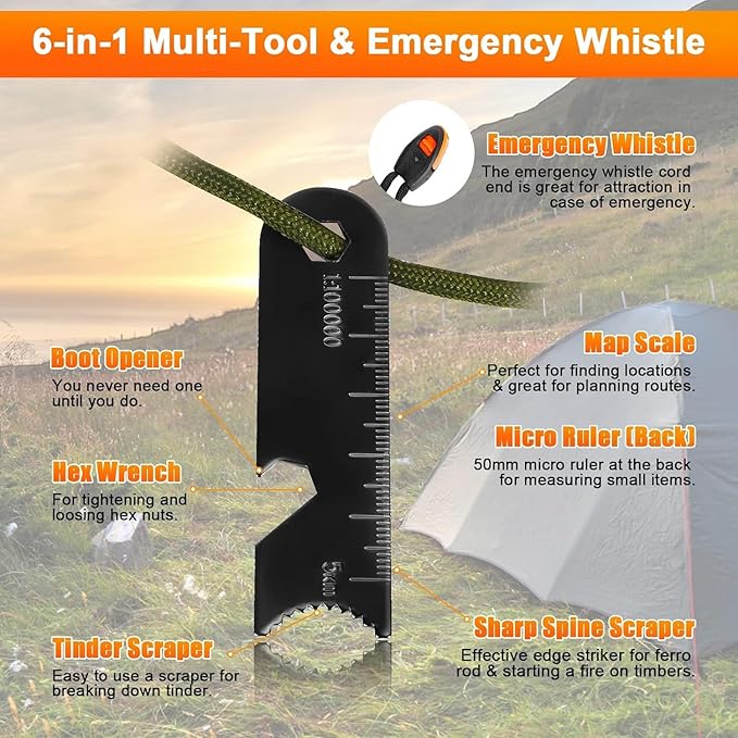 - All-in-One Survival Tool: In addition to its main ignition start function, it also includes a whistle for emergency signals, a sturdy and multifunctional steel scraper that can serve as a straight-edge striker, scraper, map scale, ruler, and hex wrench.