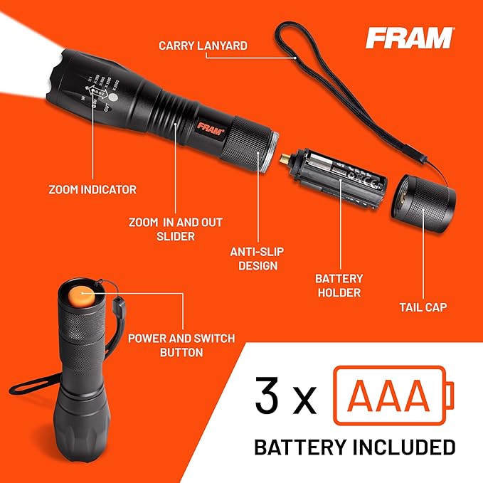 - PERFECT CHOICE: The FRAM Handheld Flashlight is Perfect for household tasks, dog walks, or camping, it's the ideal led flashlight.