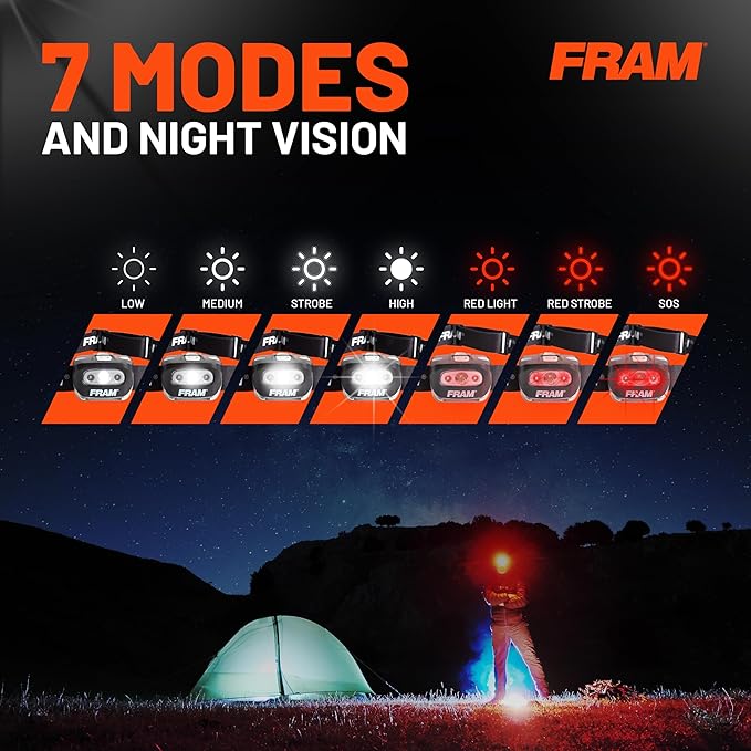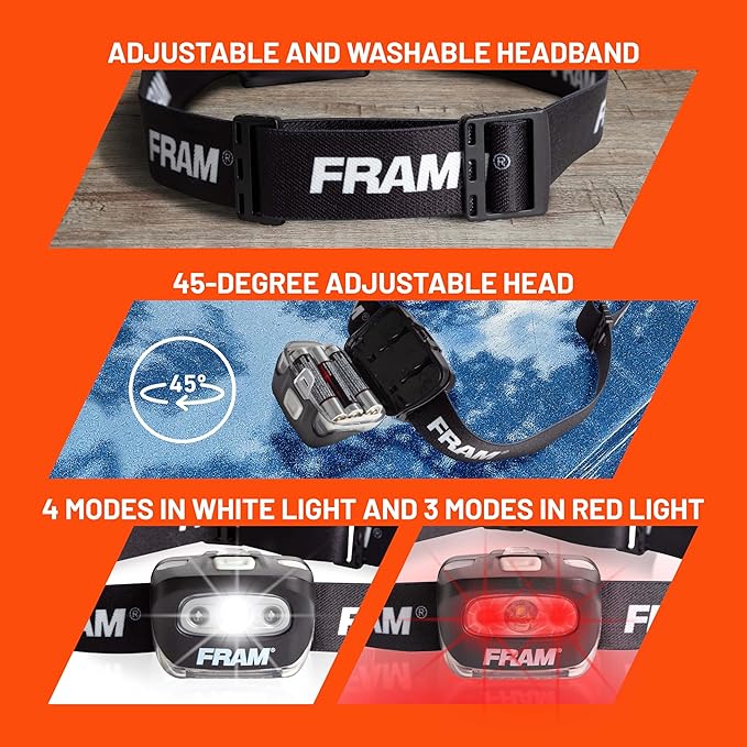 - VERSATILE DESIGN: The FRAM Headlamp Feature a 45-degree adjustable head to direct led light precisely where you need it. Choose from 7 different lighting modes, ranging from white strobe to red beam for safety.