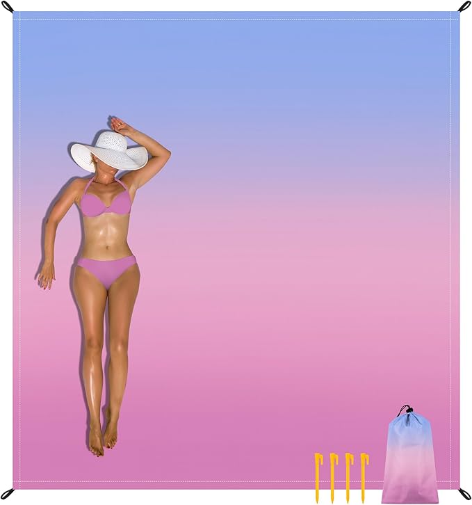 Large Beach Blanket Waterproof Sandproof, Blue Pink Gradient Weighted Polyester Picnic Blanket Windproof w/Stakes and Sand Pockets, Outdoor Camping Beach Mat Sand Free Fits 8 Adult for Travel, Hiking