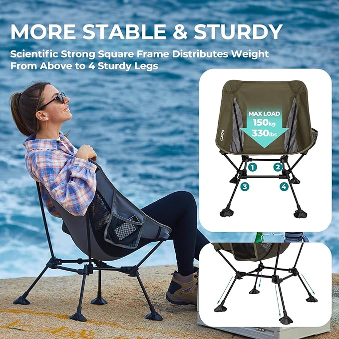- Built to Stay Put: No Matter the Terrain: Equipped with oversized anti-sinking feet and made with 7075 aviation-grade aluminum alloy, this chair stands firm on sand, grass, or rocky surfaces. It’s ultra-light yet surprisingly sturdy, offering stable seating for adults up to 330 lbs.