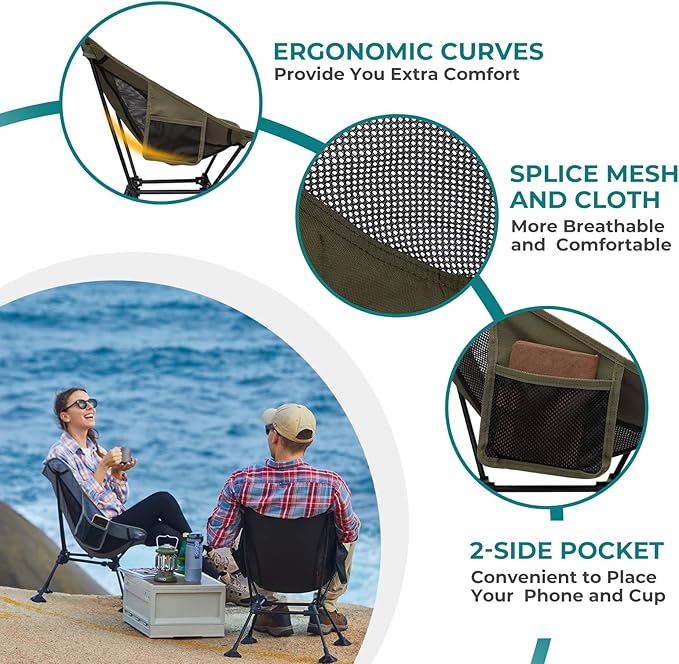 - Ready for Any Outdoor Occasion: From beaches to backcountry, tailgates to festivals—this ultralight chair is your go-to companion. Whether you're hiking, fishing, camping, or catching sunset views, it's made to support your adventures anywhere, anytime