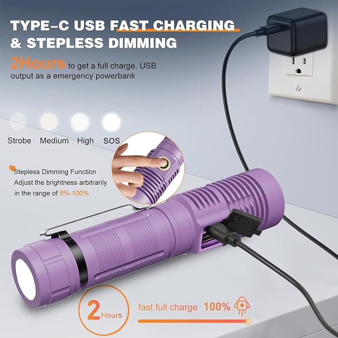 - USB-C RECHARGEABLE & Powerbank : Rechargeable Tactical flashlight have USB-C port for 4hours fast charging and USB output used as emergency powerbank to charge your phone , GPS, Camera , a good helper during in your camping trip or emergency use. Tip: This rechargeable flashlight power button light color will turn green when it full chagred , and red means its in charging.