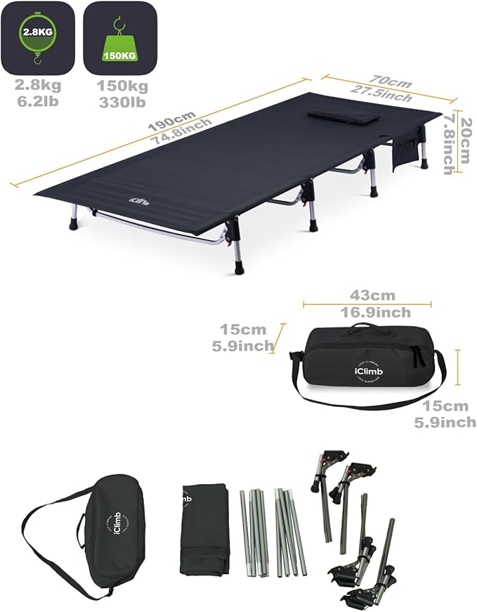 iClimb Super Easy Assemble Folding Cot Ultralight Compact Heavy Duty with Carry Bag for Adults Camping Backpacking