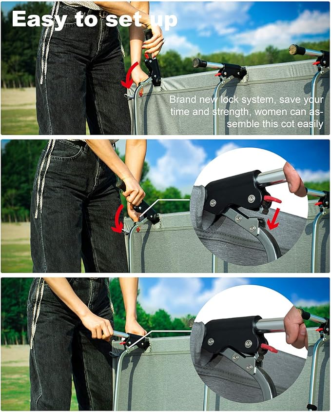 - VERY QUICK and EASY SETUP, save your precious time and strength. With the brand-new locking system of the legs, people without much strength can assemble this cot easily. Instructions included.